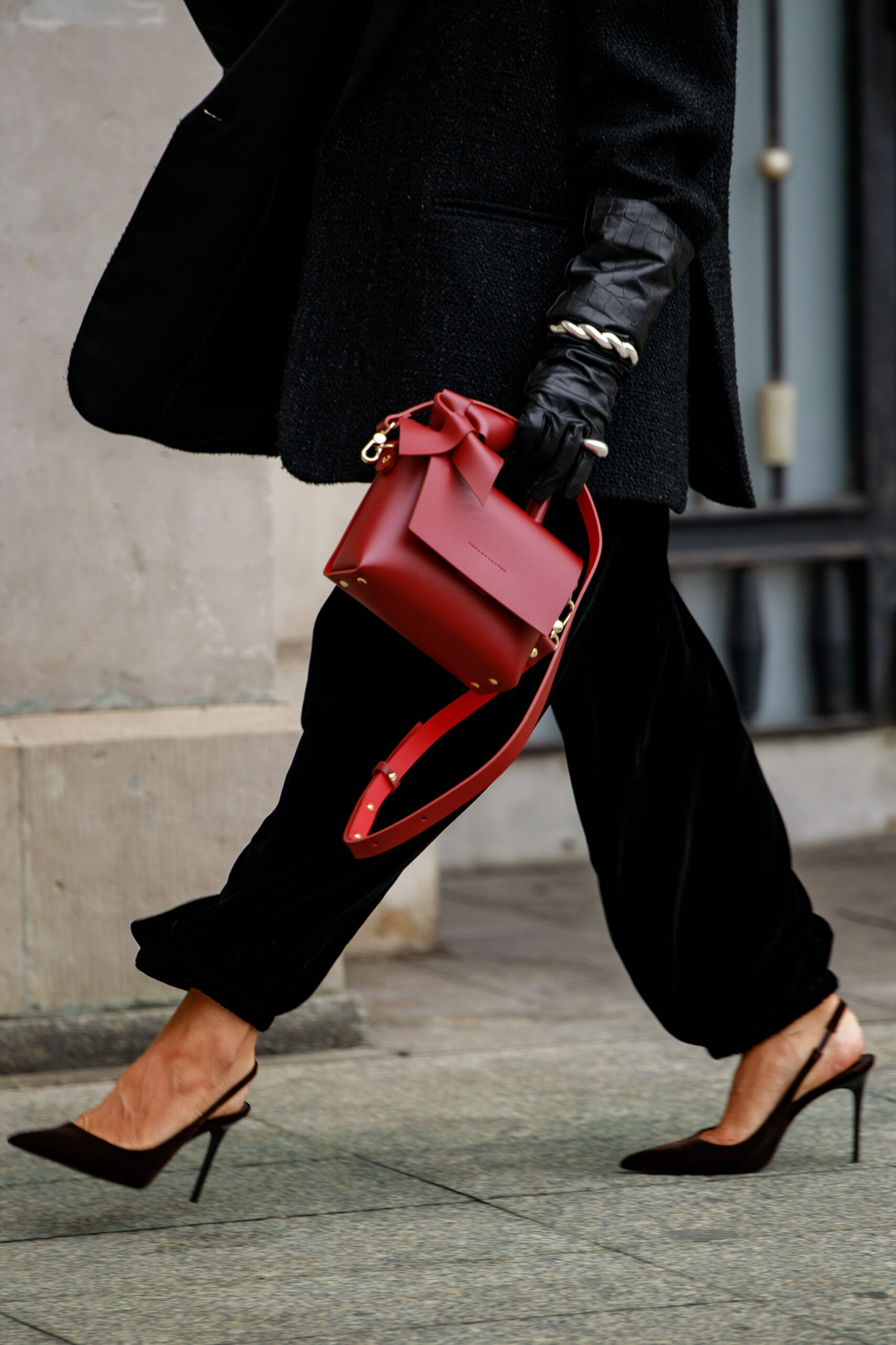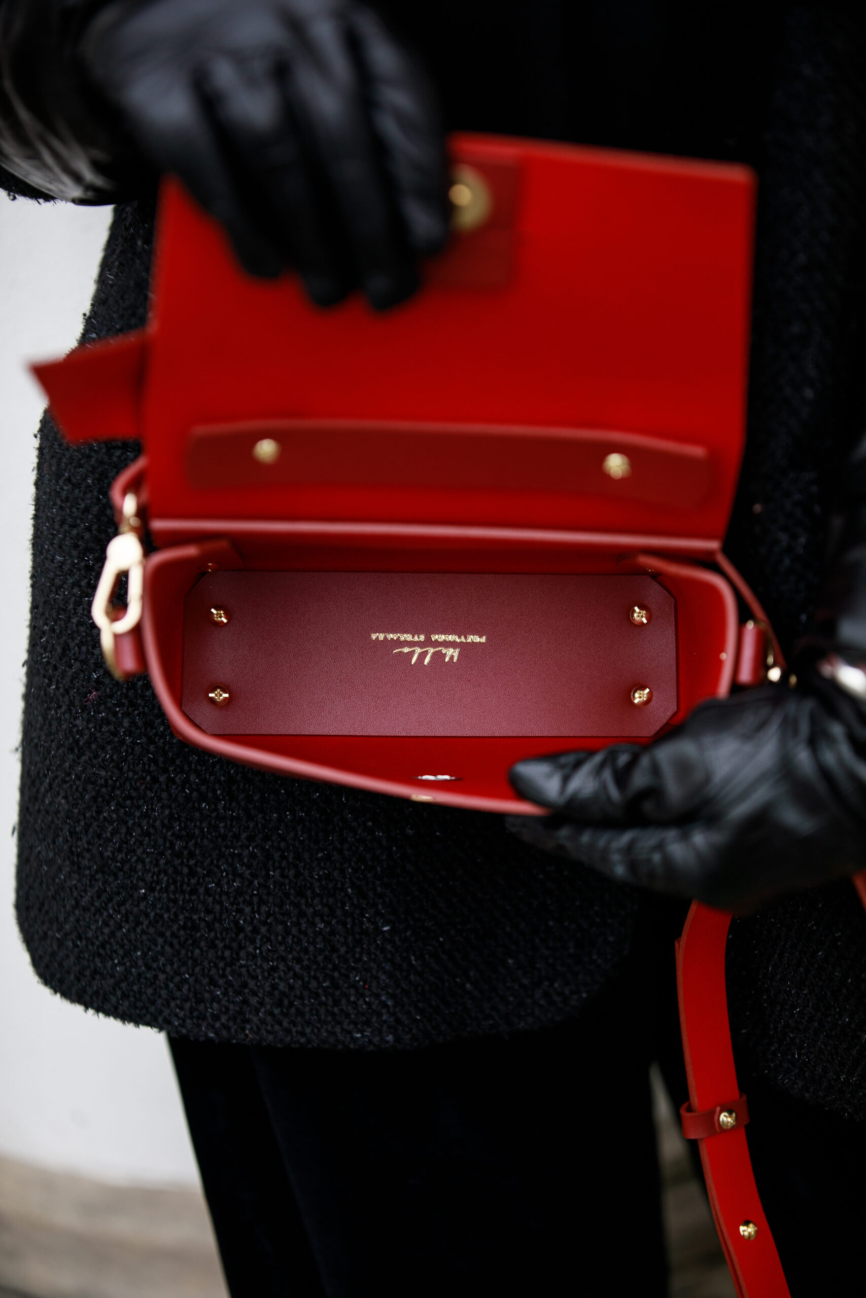 Mała torba wykonana ręcznie ze skóry naturalnej w kolorze pięknego, głębokiego burgundu, łączona srebrnymi lub złotymi nitami do wyboru i zamykana na mocny magnes. Swobodnie mieści mały portfel, telefon, drobne kosmetyki i akcesoria. Jest bardzo poręczna i wygodna w użyciu. Jest sztywna, trwała i odporna. Posiada regulowany pasek, który możesz na stałe odpiąć oraz skórzaną kokardę. Na życzenie możemy przymocować kokardę do klapki dodatkowym nitem, aby się nie przesuwała. Nie jest to widoczne od zewnątrz i nie ogranicza funkcjonalności klapki, jednak wymaga wykonania dodatkowego otworu, dlatego nie będzie możliwe noszenie torby bez kokardy. Torba nie posiada podszewki i wewnętrznej kieszeni i za tę prostotę ją pokochasz.