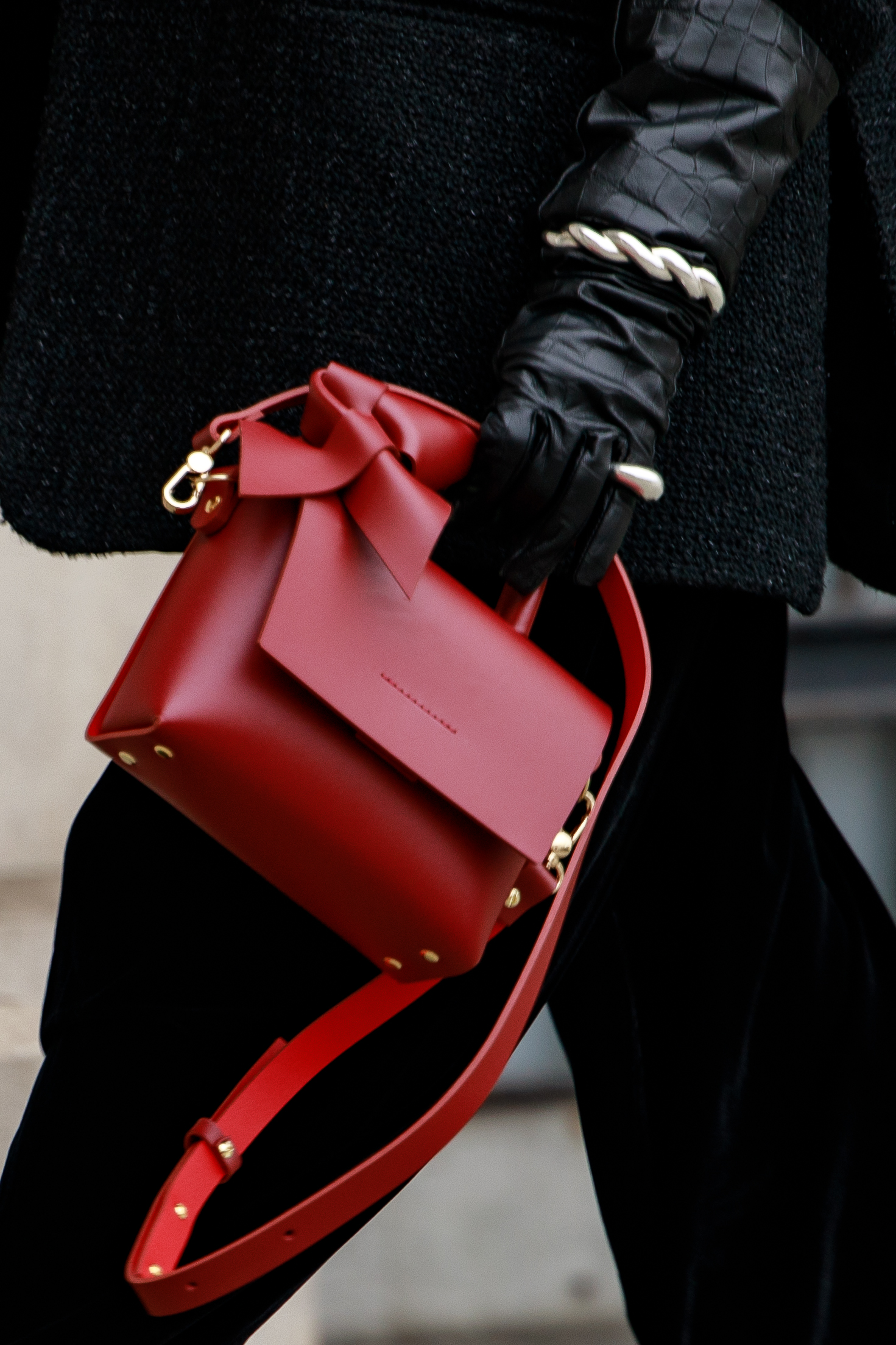 LIMITOWANA SERIA * Mała, ręcznie zrobiona torebka ze skóry naturalnej z ozdobną skórzaną kokardą w kolorze pięknego, głębokiego burgundu.