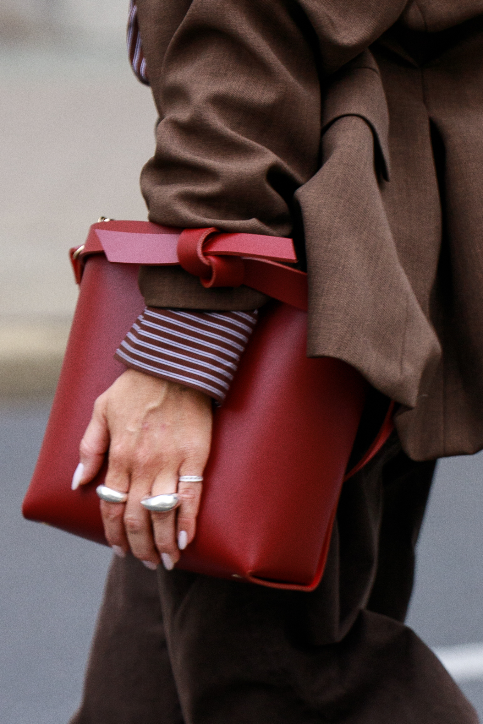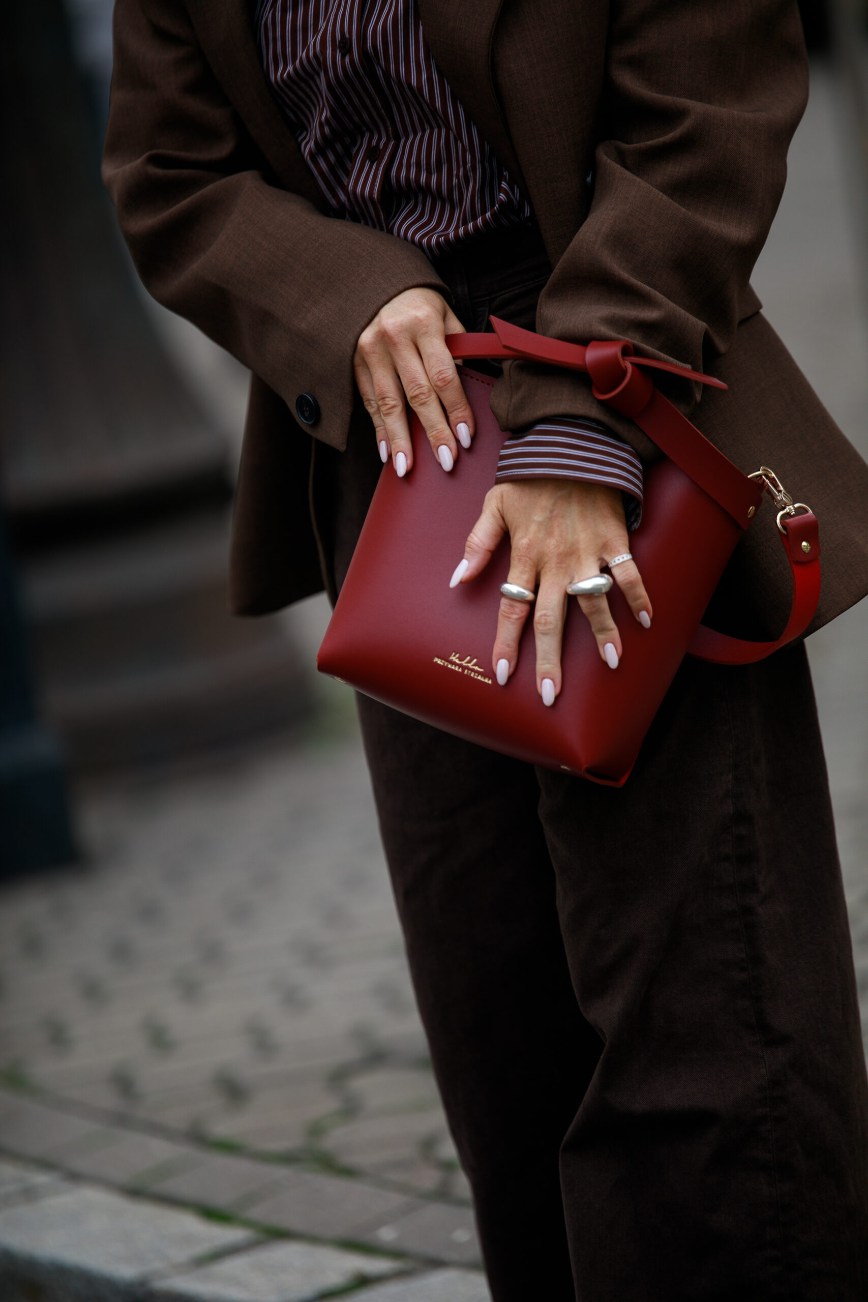 Torba wykonana ręcznie ze skóry naturalnej w kolorze pięknego głębokiego burgundu, ze srebrnymi lub złotymi nitami do wyboru i zasuwana na zamek. Jest sztywna, trwała i odporna na deszcz. Posiada regulowany pasek, który możesz na stałe odpiąć oraz krótką rączkę zamocowaną na stałe. Torba nie posiada podszewki i wewnętrznej kieszeni i za tę prostotę ją pokochasz. Minimalistyczna, elegancka i wygodna w noszeniu.