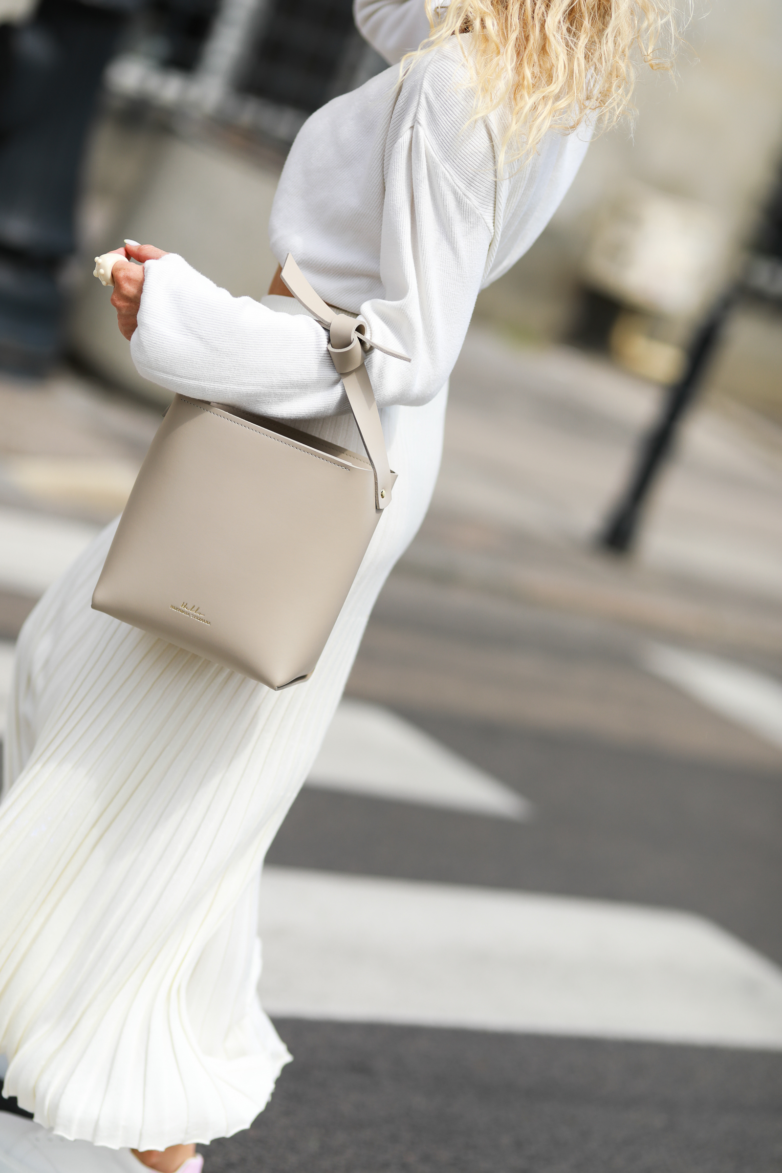 Torba wykonana ręcznie ze skóry w kolorze jasnego pisakowego beżu, ze srebrnymi lub złotymi nitami do wyboru i zasuwana na zamek. Jest sztywna, trwała i odporna na deszcz. Posiada regulowany pasek, który możesz na stałe odpiąć oraz krótką rączkę zamocowaną na stałe. Torba nie posiada podszewki i wewnętrznej kieszeni i za tę prostotę ją pokochasz. Minimalistyczna, elegancka i wygodna w noszeniu.