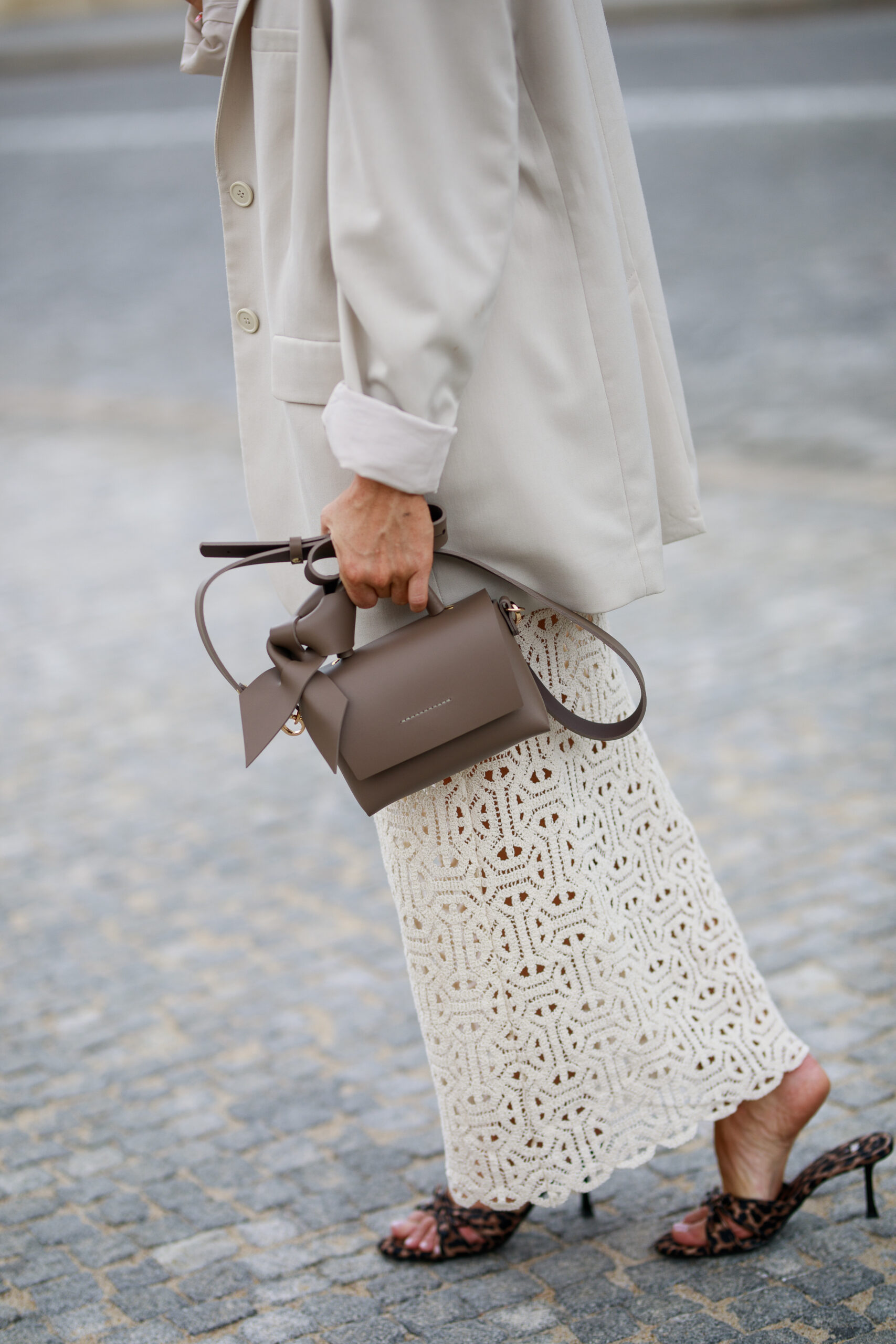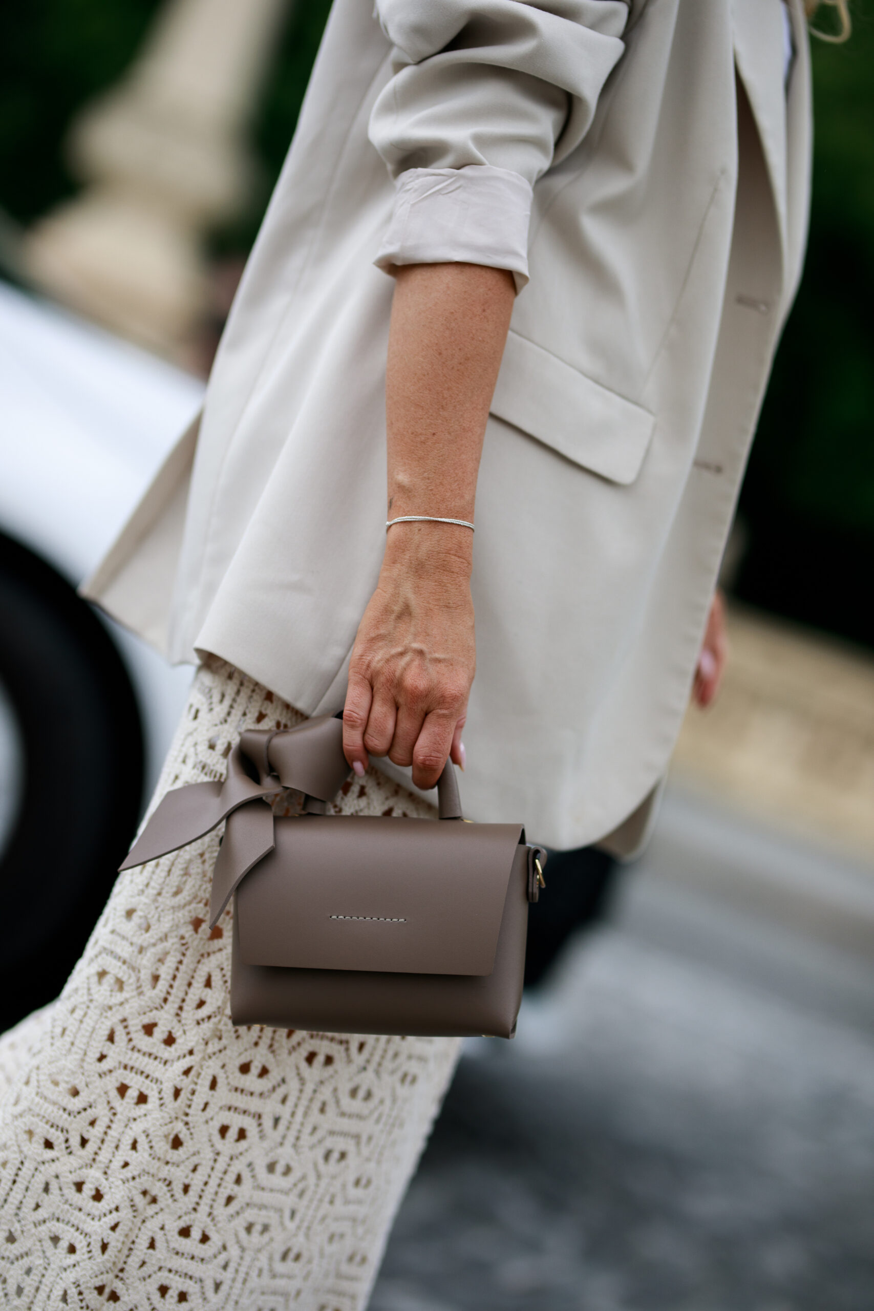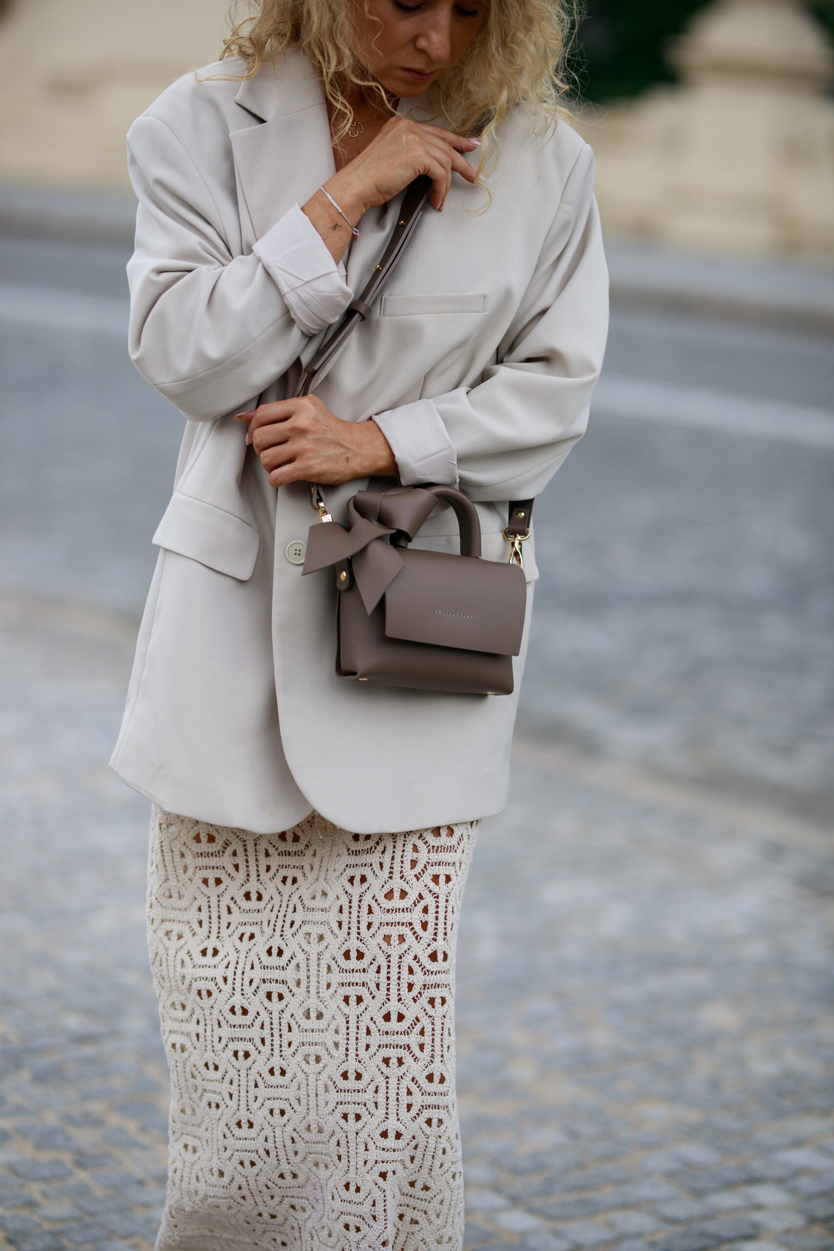 Malutka torba wykonana ręcznie ze skóry naturalnej w kolorze pięknego koloru taupe, łączona srebrnymi lub złotymi nitami do wyboru i zamykana na mocny magnes. Mieści mały portfel, telefon i drobne akcesoria. Jest bardzo poręczna i wygodna w użyciu. Jest sztywna, trwała i odporna. Posiada regulowany pasek, który możesz na stałe odpiąć oraz skórzaną kokardę. Torba nie posiada podszewki i wewnętrznej kieszeni i za tę prostotę ją pokochasz.