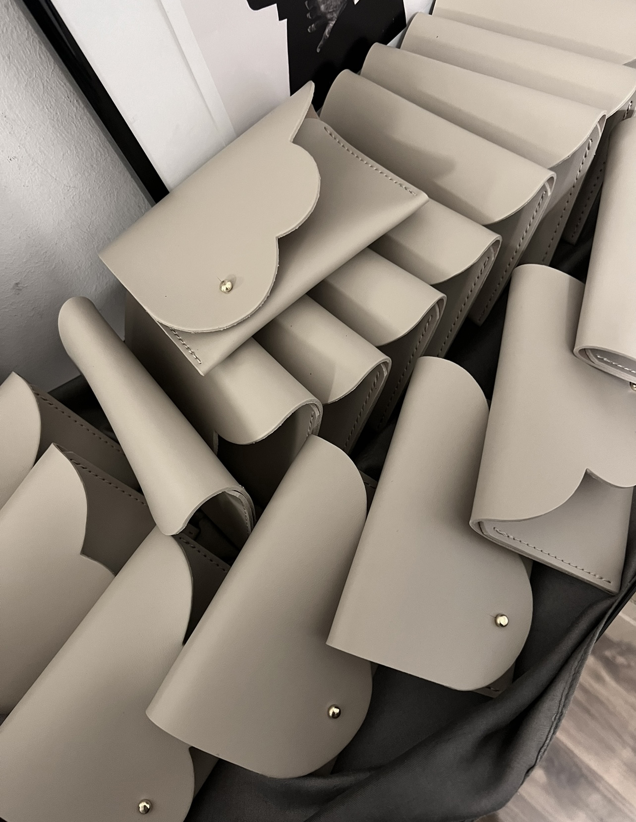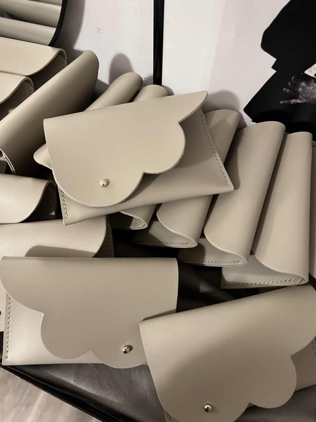 Mały minimalistyczny portfel z klapką w kształcie chmurki.